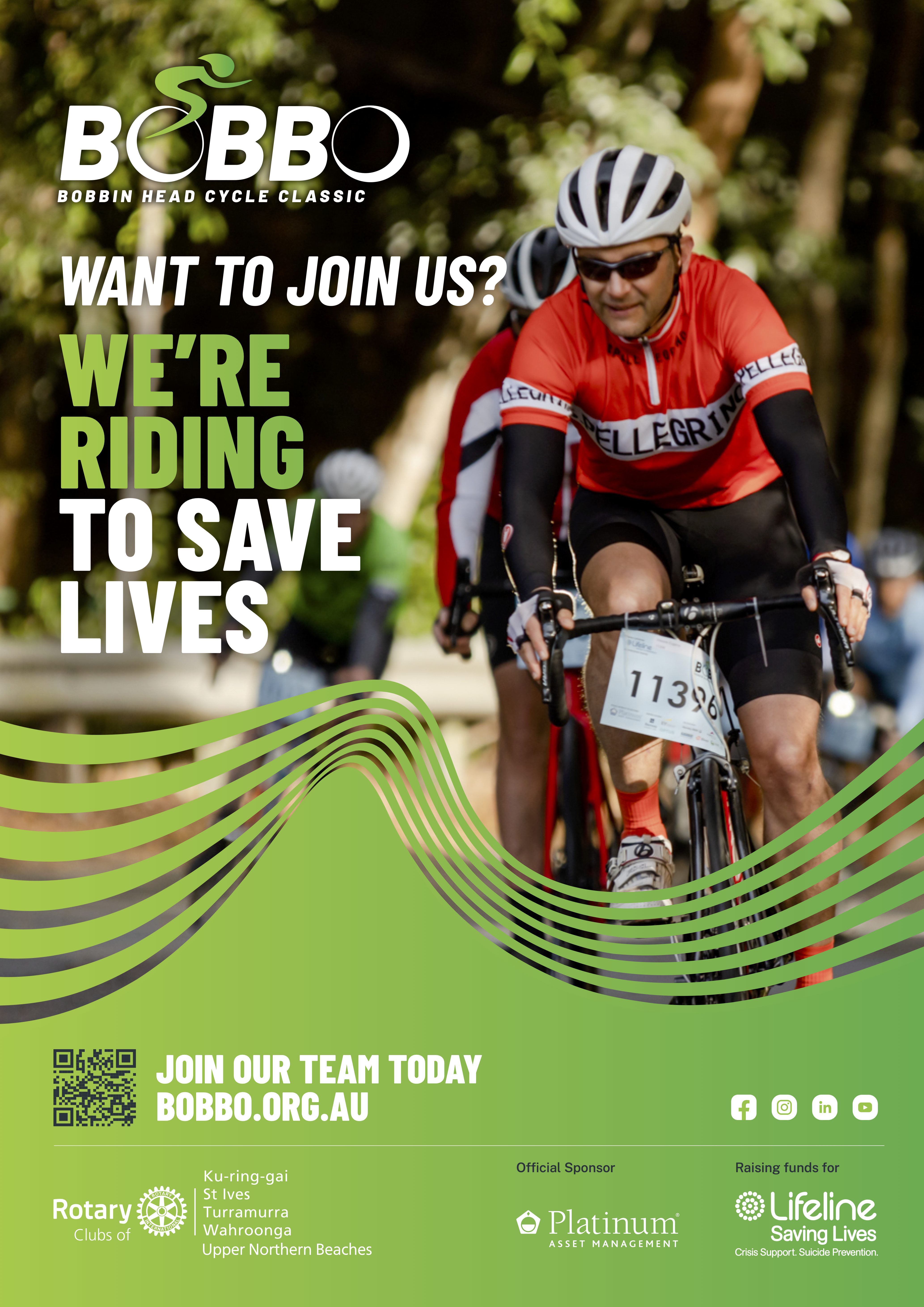 Bobbin Head Cycle Classic is organised by the Rotary Clubs of Ku-ring-gai, St Ives, Turramurra, Wahroonga & Upper Northern Beaches.